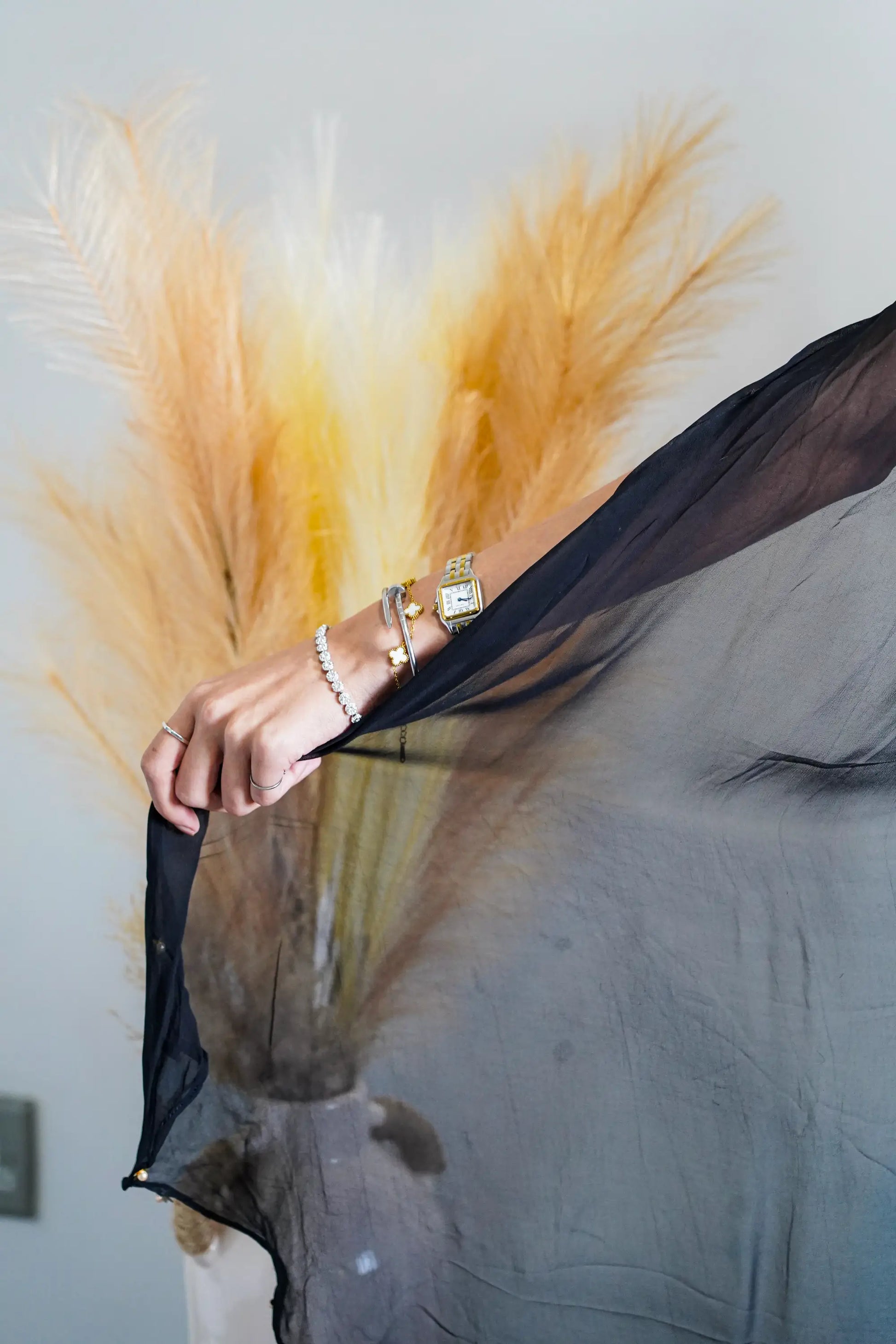 Elevate your collection with this elegant black cape-style outfit. Crafted from premium chiffon, it features sheer flowy sleeves and a keyhole neckline adorned with delicate bead embellishments. The modern silhouette blends sophistication and comfort, making it a perfect choice for evening wear or formal occasions